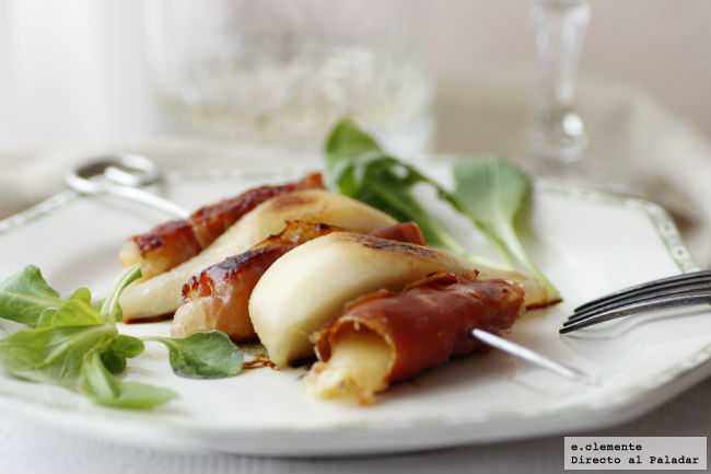 Brochettes de pera, queso y jamón