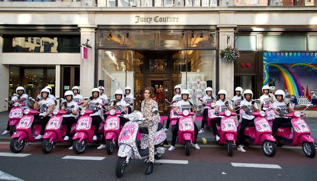 Juicy Couture ha habierto su nueva flagship store en Regent Street y ha querido celebrarlo. La marca ocupó la calle y la entrada de la tienda con modelos masculinos subidos en unas coloridas vespas del tono característicos de la marca. Todo Londres se enteró de esta esperada apertura, puesto que las vespas de Juicy Couture pasearon por la ciudad para recordar que la boutique ya estaba abierta al público. Pero la protagonista fue la modelo Tali Lenox, que lideró la marcha de vespas por la famosa calle comercial de la capital inglesa. Tali Lenox iba vestida de la firma, aportando ese carácter fresco, juvenil y atrevido de Juicy Couture. La modelo lució uno de los looks más originales de la nueva colección Otoño-Invierno, y ese mismo estampado coloreaba la vespa que conducía.