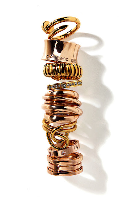 De arriba abajo: Anillo de oro amarillo en forma de clavo, de Cartier (1.770€); de metal rubedo, de Tiffany & Co. (595€); sortija de plata de ley recubierta de oro amarillo, de Aristocrazy (59€); hexagonal de oro amarillo y diamantes, de Mont Blanc (3.000€); sortija en oro rosa, de Suárez (2.363€); de oro amarillo inspirado en un nudo marinero, de Tous (260€); anillo en oro rosa con diamantes, de Louis Vuitton (1.800€); en oro rosa con forma de arandela, de Bvlgari (1.250€).