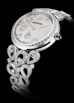 | El reloj “Pétales Entrelacés motif’’, pieza única cuyo bisel se ha embellecido con cuarenta y cuatro diamantes en talla baguette y la corona con el diamante blanco patentado por Montblanc. 120.000 €. |