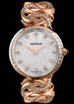 | El reloj “Pétales Entrelacés motif’’, pieza única cuyo bisel se ha embellecido con cuarenta y cuatro diamantes en talla baguette y la corona con el diamante blanco patentado por Montblanc. 120.000 €. |