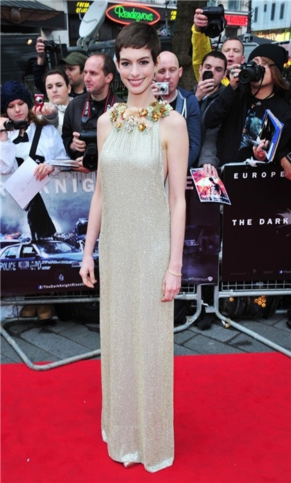 | Anne Hathaway con un impresionante vestido de la colección Crucero de Gucci 2013 con cuello de flores en el estreno de la última entrega de Batman en Londres. (FOTO: GTRES) |