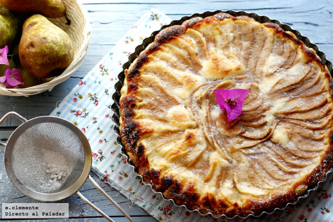 - . Disponer en un molde de 23 cm desmontable la masa quebrada forrando la superficie y pinchar con un tenedor por el fondo y los laterales. Llevar a la heladera mientras se precaliente el horno a 180ºC. Hornear durante 10 minutos la base de la tarta. Retirar del horno y reservar. Pelar y cortar en rodajas finas las peras, colocar en un plato y reservar. Colocar en un bol la manteca, el azúcar, la almendra molida y batir hasta que se vuelva una masa pálida. Añadir los huevos de uno a uno y batir hasta incorporarlos. Luego verter 2 cucharadas soperas del licor, la harina, batir lo justo hasta incorporarla y que no se formen grumos. Distribuir la pasta frangipane (*) sobre la masa semihorneada y colocar las rodajas de pera por encima. Hornear unos 50 minutos o hasta que esté firme al tacto. Mientras combinar el resto del licor con la mermelada templada y pincelar la superficie de la tarta una vez salida del horno. Espolvorear con el azúcar impalpable