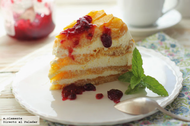 § 250 g de queso mascarpone, 300 ml de crema batida, 40 g de azúcar, 1 yema de huevo, 60 ml de Grand Marnier, jugo de 1 naranja, 2 mangos medianos, 250 g de vainillas, mermelada de frambuesa para decorar (opcional)