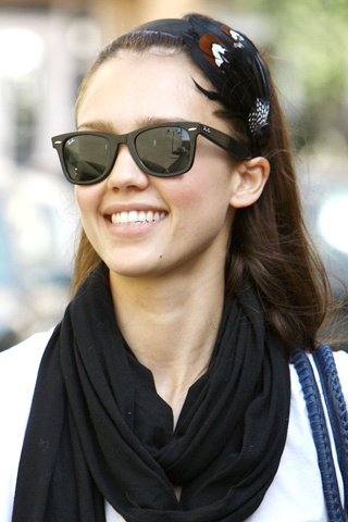 Jessica Alba puede presumir, entre otras cosas, de tener un buen arsenal de diademas y detalles varios para el cabello. Para rematar un look casual compuesto por T-shirt blanca y jeans, la actriz se decanta por una diadema sofisticada con plumas que nos encanta. Las Wayfarer ponen el contrapunto a su outfit.