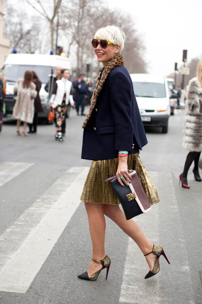 falda tableada totalmente femenina con un blazer de doble botonadura y corte masculino. Impecable los touchs dorados y animal print