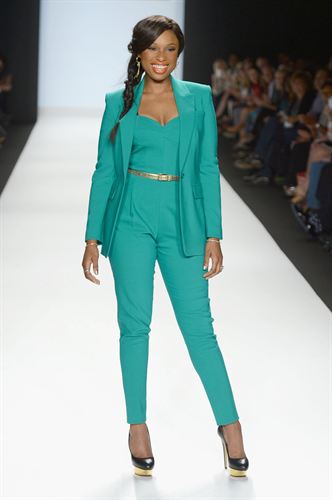 Jennifer Hudson estaba sencillamente espectacular con un traje pantalón en tono turquesa combinado con complementos dorados como un estrecho cinturón y unos pendientes extra largos.