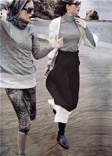 | Izq. suéter y top de látex de missoni, pantalón y anteojos de chanel y las botas, de jimmy choo. Der. cardigan de pedro del hierro, jersey de petit bateau y falda de chanel. botas de jimmy choo |