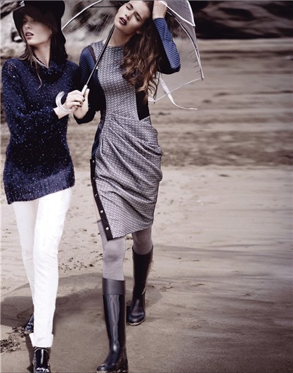| Izq., la sencillez está en el jersey, el pantalón y los zapatos , todo de chanel. Der. la feminidad del vestido de sportmax contrasta con las botas de jimmy choo y paraguas de el corte inglés |