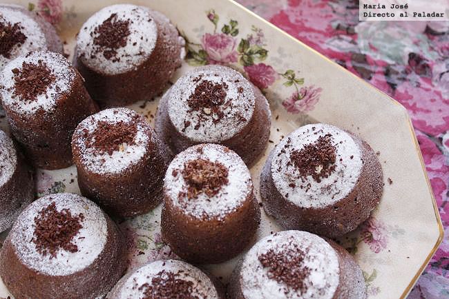 - Poner en un bol la manteca y el chocolate negro. Derretir en baño de María. Retirar el bol del fuego, añadir la harina y las avellanas a la mezcla de chocolate, removiendo con una espátula. Aparte, batir los huevos con el azúcar hasta que la mezcla blanquee y quede espumosa. Por último, unir ambas masas, removiendo con la espátula y realizando movimientos envolventes. Untar los moldecitos con manteca, rellenar con la masa y hornear a 180ºC durante 15 minutos. Dejar enfriar y desmoldar. Antes de servir, espolvorear con azúcar molido y virutas de chocolate.