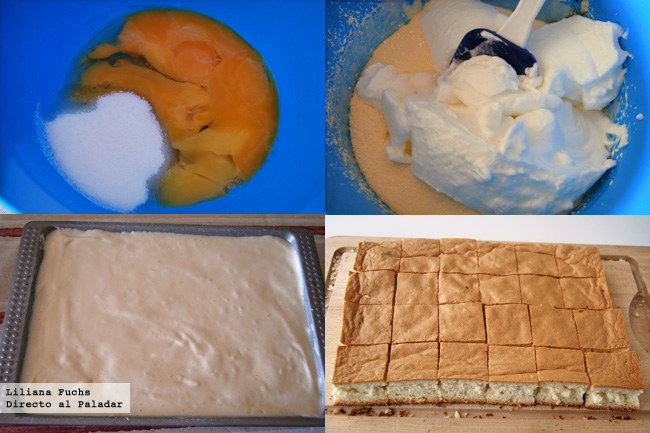 •  Precalentar el horno a 180ºC y preparar un molde rectangular poco profundo. Para ello, cubrir con una capa de manteca o aceite, espolvorear con harina tamizada encima y dar unos golpes para retirar el exceso. En un recipiente grande, verter uno de los huevos. Acercar otro cuenco más pequeño y separar las yemas de las claras de los demás, dejando las cinco claras aparte. Pesar 100 gr de azúcar e incorporarlo a las yemas con el huevo entero. Batir con ayuda de una batidora de varillas a velocidad alta, hasta que haya crecido y tenga un color pálido. Añadir la vainilla y batir un poco más. Con las varillas bien limpias y secas, batir las claras en punto de nieve. Añadir los 50 gr de azúcarrestantes, una pizca de sal y seguir batiendo hasta que tenga una consistencia bien firme. Incorporar las claras a las yemas con suavidad. Tamizar encima la harina con la maizena, y trabajar la masa con cuidado, con movimientos envolventes y suaves, usando una espátula. Verter en el molde e igualar la superficie con suavidad. Hornear sobre una rejilla durante unos 30-35 minutos o hasta que al pinchar con un palillo salga limpio. Dejar enfriar, desmoldar y cortar en porciones cuadradas de unos 5 cm de lado. De forma opcional, se les puede dar un aspecto visual más bonito tostando su exterior. Para ello, colocar las porciones, ya frías y cortadas, en una bandeja y hornear unos instantes con el horno a máxima potencia, usando la opción del gratinador si se tiene. Vigilarlos muy de cerca para que no se quemen.