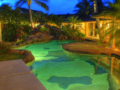 | La finca cuenta con varias piscinas. La de la imagen, imita a una laguna tropical. |
