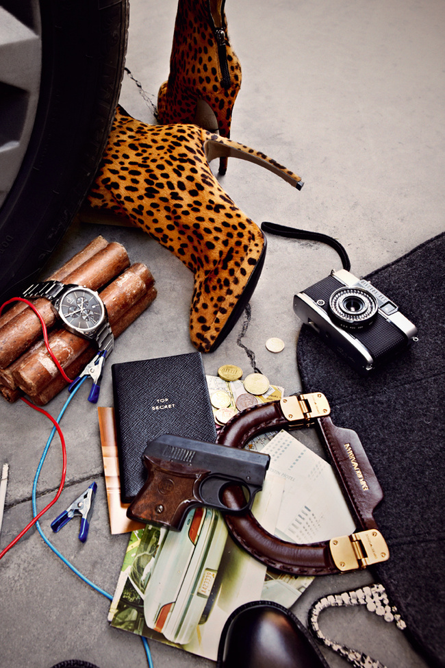 | Reloj, de Calvin Klein; bolso, de Emporio Armani; collar, de Fahoma; botas de leopardo, de Walter Steiger; agenda, de Smythson; y zapatos masculinos, de Church’s |