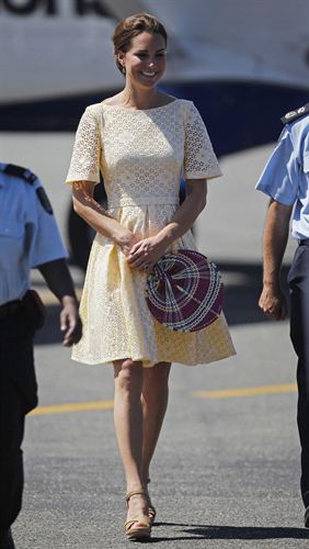 Durante su viaje a Asia, la duquesa lució este vestido, un modelo veraniego amarillo con bordados ingleses, falda de vuelo y manga francesa. Hasta ahora era uno más de los modelos de la princesa pero tras hacerse público que es uno de los diseños de Catalina el vestido se ha convertido en el centro de todas las miradas.