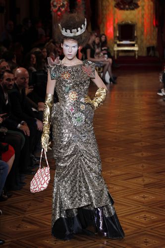 Vivienne Westwood trae looks de otra época, teñidos en su mayoría con tonos pastel y bajo los que las modelos se esconden tras exóticas caretas. Faldas largas metalizadas y abullonadas camisas floreadas conviven siguiendo una misma línea.