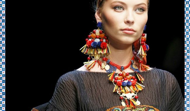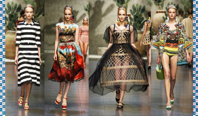 Los diseñadores italianos no han querido renunciar al barroco siciliano que ha caracterizado sus últimas colecciones, al utilizar algún estampado con escenas de un cuadro y con pendientes que vuelven a tocar los hombros, en esta ocasión como si se tratara de ramos de frutas de multitud de colores, también se han servido del mimbre para sus prendas, visibles en las sandalias atadas en los tobillos o en los bolsos.