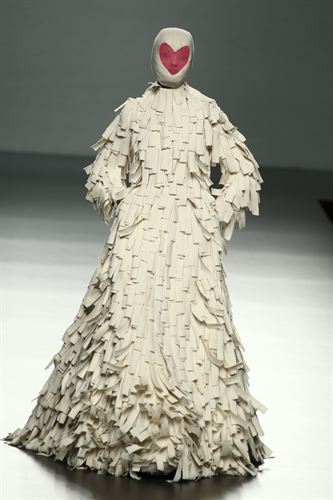 Inspiración navideña en un desfile de Agatha Ruiz de la Prada en el que se han podido ver bolas de colores y espumillones. El toque final: el vestido de novia. Un diseño de manga larga y cola compuesto de tiras blancas. Éxito rotundo.