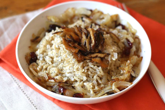 Arroz integral con champignones, cebolla caramelizada y arándanos