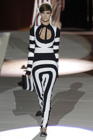 - ¿Quién? Aunque Pierre Cardin dio unas cuantas pistas de esta tendencia minimalista en su colección de influencia espacial en los setenta, ha sido Marc Jacobs para Louis Vuitton el que se ha ganado el cetro esta temporada. Inspirado en el trabajo del artistaDaniel Buren, la firma convirtió el Palais Royale de París en un enorme tablero de damas de color amarillo. Las modelos, por parejas, descendían por escaleras eléctricas en una gama de dicotomías: blanco y negro, verde y blanco, amarillo y blanco. Jacobs jugó con los tamaños en los bloques que recorrían sus prendas y solo ofreció una pequeña tregua para incluir flores, en su delineado más abstracto. «Pretendíamos un fuerte impacto visual, pero desde una perspectiva no romántica, no emocional», explicó el diseñador durante la presentación de la colección.