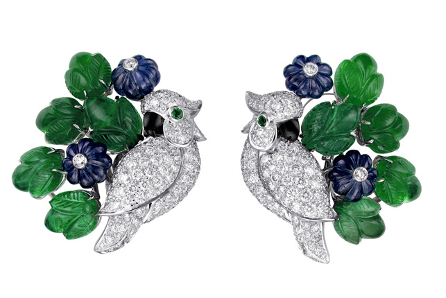 Al igual que le ocurriera a Tippi Hedren en su papel de Melanie Daniels en Los Pájaros, nos hemos obsesionado con estos -en esta ocasión- simpáticos animalitos dediamantes, esmeraldas, zafiros y madreperla -en el pico- sobre oro blanco deCartier. Con un diseño figurativo encantador, y a la vez elegante, flora y fauna se aúnan para inspirar unos pendientes exóticos y coloridos que lo mismo podríamos imaginar sublimando un look de la mismísima Carmen Miranda, sobre la alfombra roja más sobria o conquistando a grandes adeptas de la firma como lo fue en su día Wallis Simpson.