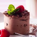 Se puede preparar en moldes individuales como la foto y decorar cada uno con el betún de chocolate y unas frambuesas. La otra opción es cortar el pastel con un molde de galletas y presentarlo como pasteles individuales.
