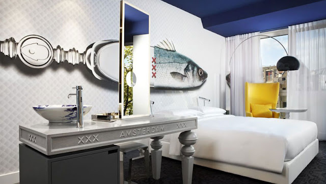 Aunque cuando menos se espera, introduce un violento rojo que recuerda que estamos en Amsterdam, donde nadie olvida el Barrio Rojo. También ha creado su propio museo en un larguísimo intercomunicador que une los diferentes edificios del hotel. En sucesivas vitrinas descubrimos los muebles y objetos que lo han hecho famoso. Hasta las salas de reuniones son pequeñas maravillas donde Wanders. Y no digamos el jardín, donde ha permitido que el artista urbano Nick Walker pintara su propia versión de la Alicia de Lewis Carroll. Las habitaciones son pequeñitas pero con un despliegue de ideas que fascinan. Las más caras, no siempre las más grandes, dan a los canales, mientras que las demás dan a ese espacio público común plagado de maravillas. Todas tienen un gran pez en la pared principal que se va metamorfoseando en cuchara, tenedor, copa u otro objeto, como un homenaje al Amsterdam polifacético que representa a través de la triple X que aparece en su bandera. Los lavabos son obras únicas pintadas por el mismo Wanders en una enésima de construcción del azul de Delft.
