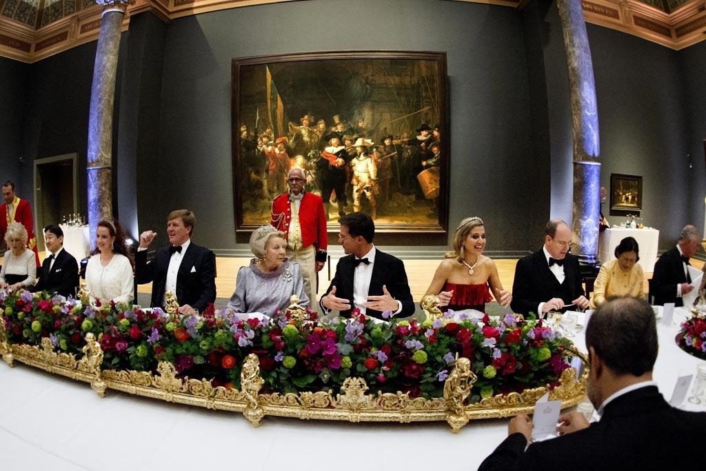 La última cena de la Reina Beatriz como Monarca de Holanda no ha podido celebrarse en mejor lugar. En el Rijksmuseum de Ámsterdam y con ‘La Ronda de Noche’, de Rembrandt, amenizando la velada.