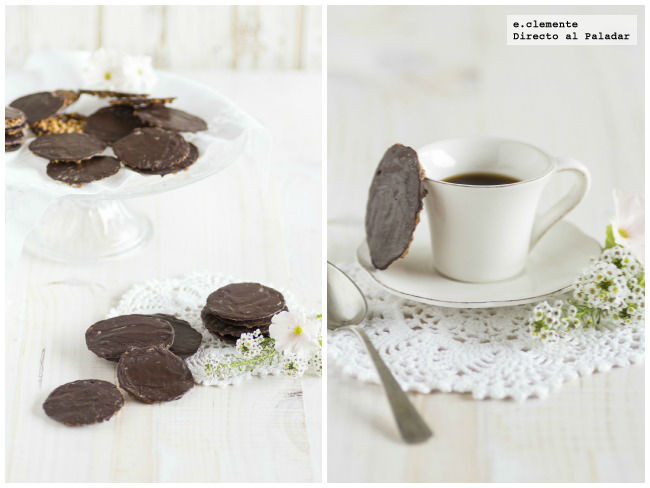 Comenzaremos poniendo al fuego en una cacerola la crema, la almendra granillo, el azúcar impalpable y la harina, removemos a fuego lento hasta incorporar los ingredientes pero sin que lleguen a hervir. Reservamos a un lado para que espese un poco la masa. Precalentamos el horno a 180 grados o a 190 grados con calor arriba y abajo. Preparamos unas placas de horno y las forramos con papel sulfurizado, entonces vamos depositando con una manga pastelera o una cuchararita una cantidad como del tamaño de una avellana, bien separadas unas de otras pues se extienden mucho al hornearse y las cocemos a esa temperatura durante unos diez minutos hasta que las veamos doradas. Las dejamos enfriar cinco minutos y las vamos despegando con cuidado del papel extendiéndolas en una encimera. Mientras, derretimos el chocolate y la manteca de cacao en una cacerola al baño María para que no se queme y una vez derretido vamos pintando con una espátula o una brocha de repostería la cara lisa de nuestras pastas, las dejamos enfriar en una rejilla hasta que el chocolate seque y ya las tenemos listas. Como se tarda un rato en pintarlas aconsejo que dejéis el baño María con el chocolate a fuego muy bajito para que la cobertura no se os endurezca mientras que lo hacéis.