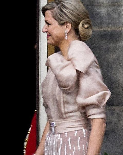Para esta ocasión se decanta por un elegante vestido largo color vino que resalta su figura. Con mucha caída, de manga larga, lánguido y un poco de cola, así es como se presenta la argentina que ha llegado a ser reina consorte de los Países Bajos. Varias pulseras y dos broches en forma de flor completan el look de la nueva reina holandesa.
