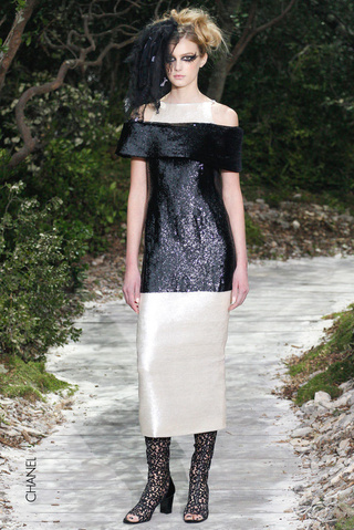Elie Saab propone transparencias embellecidas con cristales y encaje, y Chanel, vestidos de silueta retro patronados en jaretas.