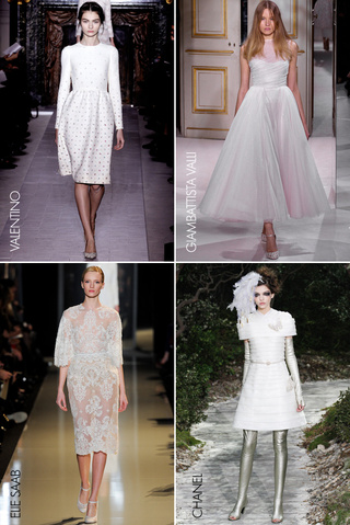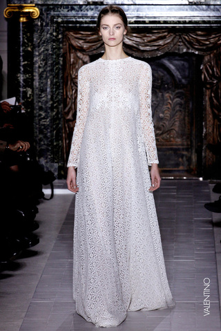 Ya lo avanzamos en Glamour: en 2013 el código nupcial cambia y se vuelve más ligero, fresco y natural con vestidos cortos hiperfemeninos. Seguramente muchas de las novias de hoy se rindan a los delicados vestidos de Valentino, elaborados con infinitos metros de tul creando volúmenes ruffles, o con su propuesta del vestido sobrio-deluxe: de manga larga, cuello cerrado y a la rodilla, dibuja a la perfección la silueta femenina y se completa con detalles de pedrería.