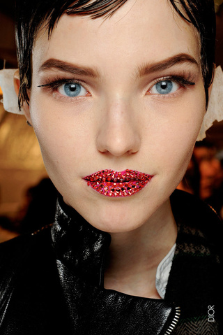 En el desfile de Raf Simons para Dior, más allá de los vestidos, lo más comentado en front-row fueron los looksbeauty de las modelos. Con un corte de pelo wet pixie, el foco de atención recayó en sus labios-joya, en distintos tonos de rojo, frambuesa y coral pero todosdecorados con cuentas de strass, consiguiendo un efecto tan magnético como lujoso. Obra de la make-up artist Pat McGrath.