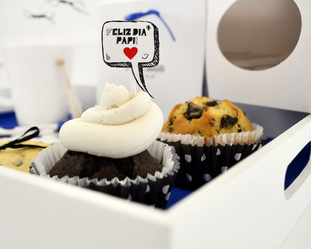 Para degustar incluye: dos popcake con granas blancas y turquesas, un muffin de vainilla y chips de chocolate, dos cookies de vainilla y chips de chocolate, dos cookies con glaseado y decoración con motivos del día del padre y una cupcake de chocolate con corazón de dulce de leche, cobertura de crema de manteca y toppers de azúcar al tono presentado en caja decorada.