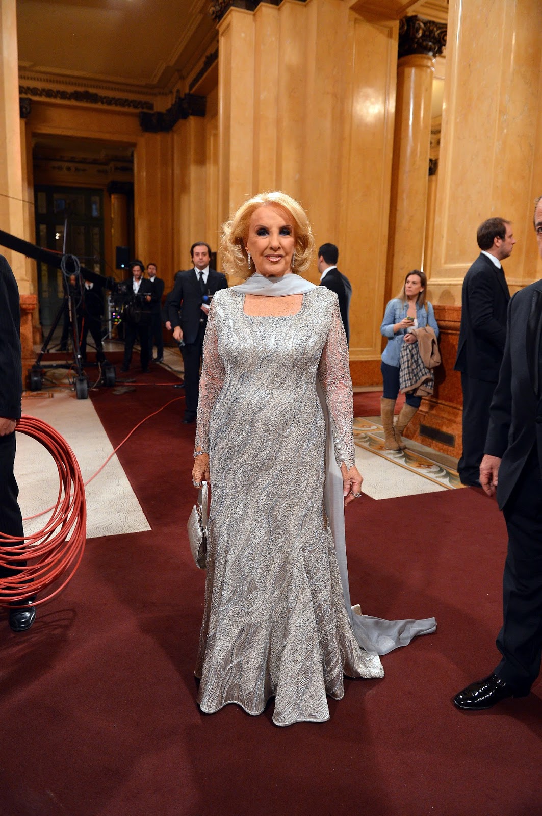 Traje de noche en seda brocada metalizada, escote francés. Delineado con bandas de encaje salpicadas en paillettes al tono creando búlgaros íntegramente aplicadas a mano. Profusamente bordado con paillettes, perlas, piedras y cristales de swarovski en tono platino.