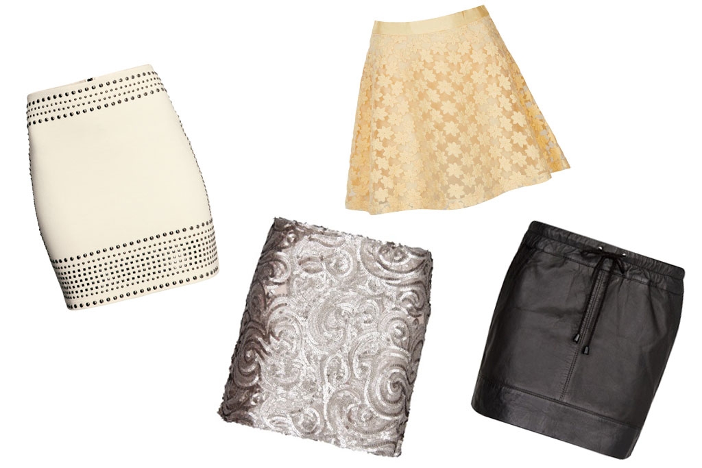 Falda de tachuelas, de H&M (P. V. P. 29,95 euros); mini de lentejuelas, de Mango (P. V. P. 14,99 euros rebajada); falda de vuelo, de Topshop (P. V. P. 26 euros rebajada), y minifalda de cuero, de Mango (P. V. P. 49,90 euros).