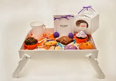 Desayuno Lovely Mom: este desayuno se arma sobre una bandeja con patas, de madera blanca barnizada de 30 x 40 cm. Incluye: un individual estampado, taza cónica blanca y cuchara de cerámica con detalle de moño y servilleta. Las infusiones se presentan en un kit que contiene: capuchino y café tostado premium en sobre, dos variedades de té gourmet, palito de azúcar cristalizado y edulcorante. En cuanto a la pastelería, este desayuno incluye: 2 popcakes con granas violetas, 2 cookies de vainilla y chips de chocolate, 2 cookies con granas violetas, 1 whoppie de chocolate blanco y marshmallow, 1 brownie de chocolate y nuez, 1 muffin de vainilla y chips de chocolate, 1 muffin de chocolate y naranja, 1 cookie con glaseado y decoración al tono, 1 cupcake de chocolate con corazón de dulce de leche, cobertura de crema de manteca y toppers de azúcar al tono presentado en caja decorada.Precio: $520.-