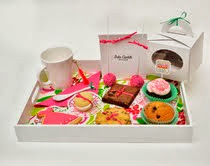 Se trata de un desayuno montado sobre una bandeja de madera blanca barnizada de 30 x 40 cm. Incluye: un individual estampado, taza cónica blanca y cuchara de cerámica con detalle de moño y servilleta. Las infusiones se presentan en un kit que contiene: capuchino y café tostado premium en sobre, dos variedades de té gourmet, palito de azúcar cristalizado y edulcorante. En cuanto a la pastelería, este desayuno incluye: 2 popcakes con granas fucsias, 2 cookies de vainilla y chips de chocolate, 1 whoppie de chocolate blanco y marshmallow, 1 brownie de chocolate y nuez, 1 muffins de vainilla y chips de chocolate, 1 cookie con glaseado y decoración al tono, 1 cupcake de chocolate con corazón de dulce de leche, cobertura de crema de manteca y toppers de azúcar al tono presentado en caja decorada. Precio: $400.-