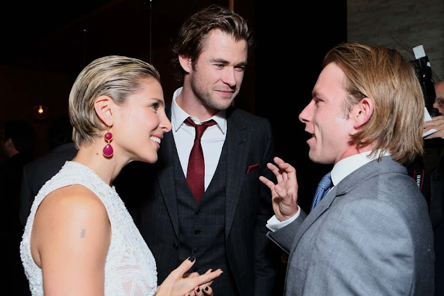Elsa Pataky, Chris Hemsworth y Tom Hunt hablan, después de asistir a la premiere de ‘Rush’, en la fiesta celebrada en el hotel Thompson de Toronto.