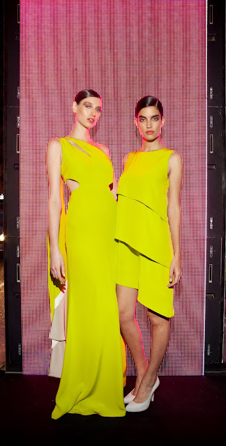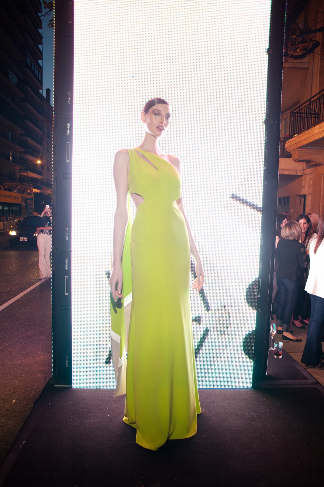 Negro, fucsia, naranja,  azul, blanco, verde lima y cemento, recorren la paleta e imprimen carga emotiva a las prendas.ZAPATOS Clásico stiletto en off white con suela pintada al tono diseñados por Ricky Sarkany para esta Colección. ACCESORIOS Gargantilla de cuero con hebilla de alpaca bañada en oro.RICKY SARKANY- Zapatos YSL- Make Up