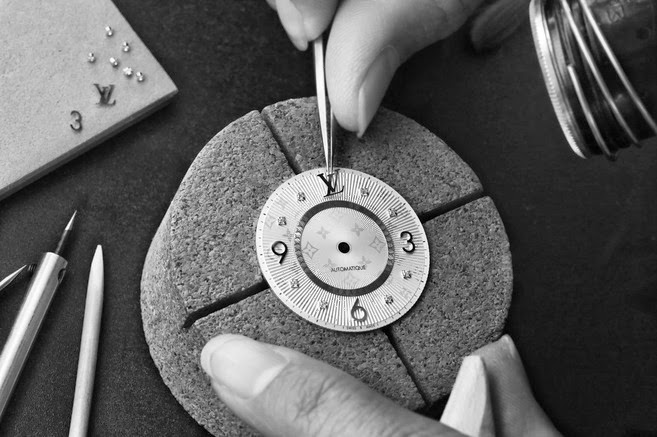 Alternando índices de diamantes, cifras Árabes y un LV al mediodía en lugar de los doce, jalonan la lectura del tiempo.