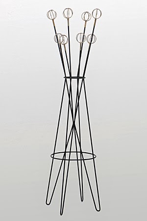 Este perchero fue diseñado por Roger Ferraud en los años 50, en Francia. La estructura es de hierro lacado en negro y las bolas superiores están realizadas en latón