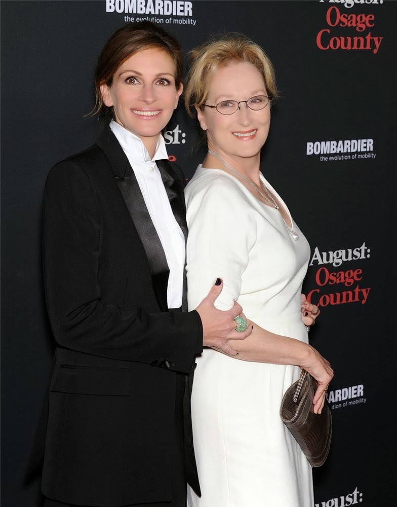 Las dos protagonistas de ‘Ausgust Osage County’ posan juntas, sonrientes, a su llegada al Weinstein Company’s, de Los Ángeles. La que fue novia de América, Julia, apostó por un traje corto de Givenchy, con chaqueta de smoking, y sandalias, también en negro. Lució joyas de Pomellato. Por su parte, Meryl lució un vestido blanco, entallado, muy favorecedor ,y zapatos y cartera en tono dorado.