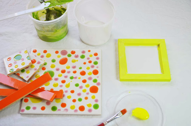 Materiales: posavasos de fibro fácil, azulejos decorados y lisos, pintura acrílica fluo, cola vinílica y pastina.