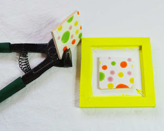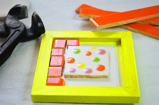 - Cortar un azulejo liso en cuadrados de 1.5 cm de lado aproximadamente y pegar alrededor del cuadrado central.