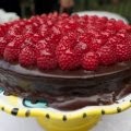 Sacar el pastel del horno y después de 10 minutos desmoldarlo y dejar enfriar completamente. Ponerlo en el platón donde se va a servir y cubrir con el chocolate. Cuando el glaseado empiece a secarse, acomodar las frambuesas arriba.