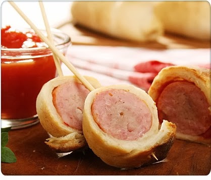 8. Calentar en horno y servir el pan con la salchicha en su interior.