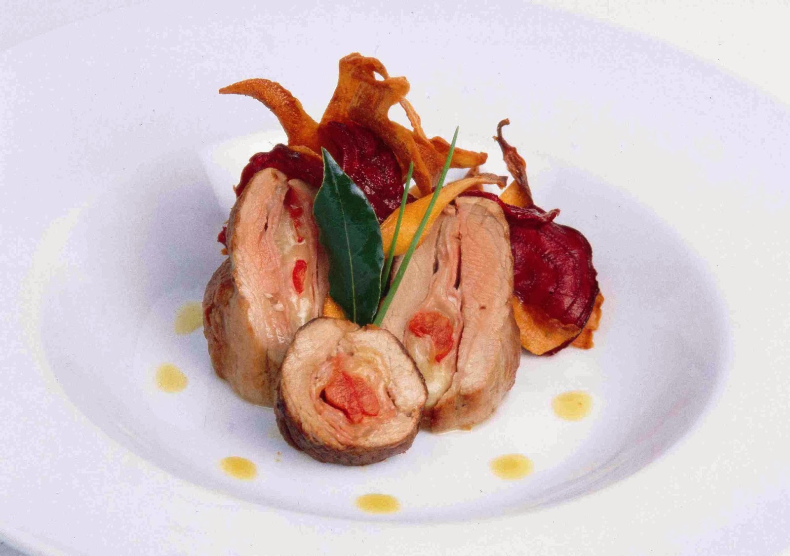 3. Para la guarnición: cortar en láminas los vegetales y freír hasta que estén crocantes.