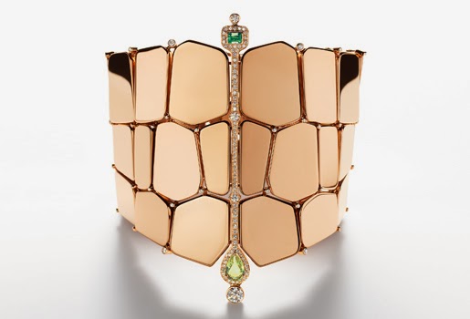 En todos los casos se trata de piezas articuladas, con movimiento, en uniforme y brillante oro rosa que se pega como una segunda piel, o, dicho con mayor propiedad, como segundas escamas. De este modo los artesanos de la casa francesa ponen en práctica su peculiar alquimia que les habilita para transfomar el oro en una lujosa dermis que acompaña los movimientos femeninos.