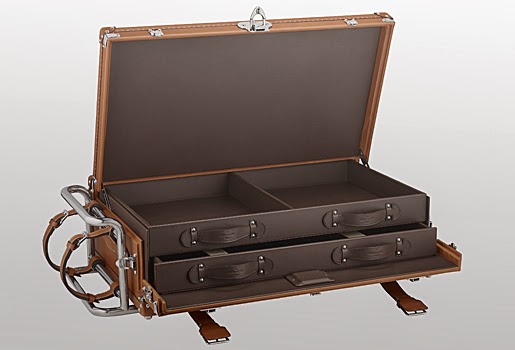 Incluye un portamantas para viajeros intrépidos y, en su interior, el equipaje se organiza en los cajones forrados de piel. Mide 60 x 40 x 36 cm y es una pieza única, como su precio, que sólo se da bajo pedido.