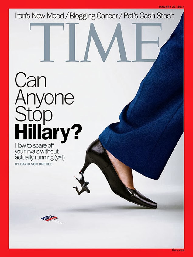 «¿Puede alguien parar a Hillary?». Un pantalón azul marino y un tacón que arrastra a un hombre diminuto. Así titula e ilustra el último número de la revista Time la supuesta campaña silenciosa de Hillary Clinton a dos años de las elecciones de EEUU. La controvertida portada nos viene a decir que Hillary, sin haber anunciado su candidatura, ya «atemoriza» a sus contrincantes frente a la posibilidad de que se presente a las presidenciales. O veáse de esta forma: para ilustrar su poder e influencia política, nada mejor que recurrir a un zapato salón que empequeñece al hombre y lo arrastra a su suerte. ¿Habría usado Time en su portada el mismo esquema (cordon de mocasín arrastrando a una mujer) si, por ejemplo, su artículo fuese sobre Paul Ryan?